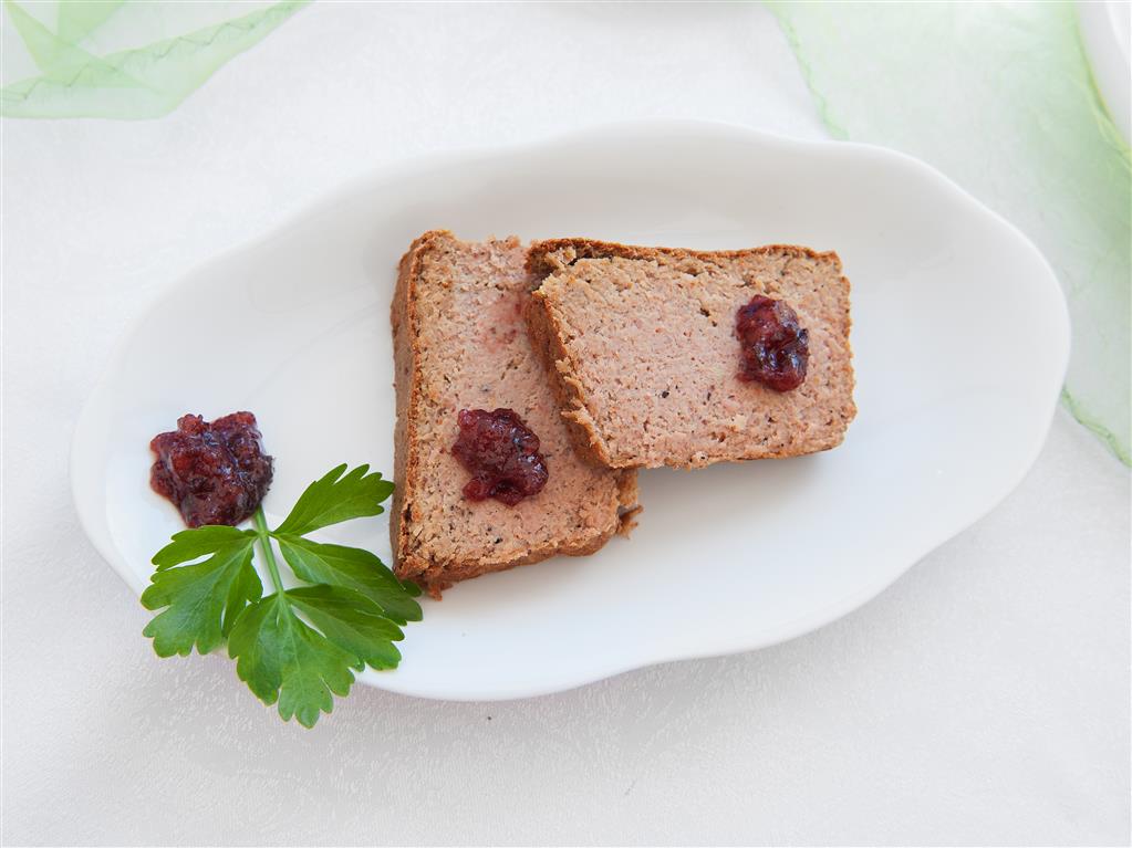 Pasztet z żurawiną: mięso gotujemy z warzywami, wątróbkę drobiową gotujemy w osobnym garnku. Po ugotowaniu przekręcamy przez maszynkę, doprawiamy. Pieczemy ok. 1 godz.