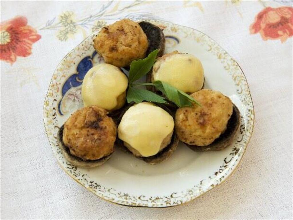 Pieczarki myjemy, wycinamy ogonki, osuszamy. Cebulę kroimy w kostkę, czosnek miażdżymy, bułki moczymy w mleku, odciskamy i dobrze rozcieramy. Wszystkie składniki wraz z mięsem, jajkami, pieprzem i solą wyrabiamy. Formujemy kulki wielkości orzecha włoskiego, obtaczamy w mące i opiekamy na oleju, następnie wkładamy do pieczarek, wykładamy na blasze do zapiekania. Zapiekamy. Kulki można dodatkowo posypać serem. Zapiec.