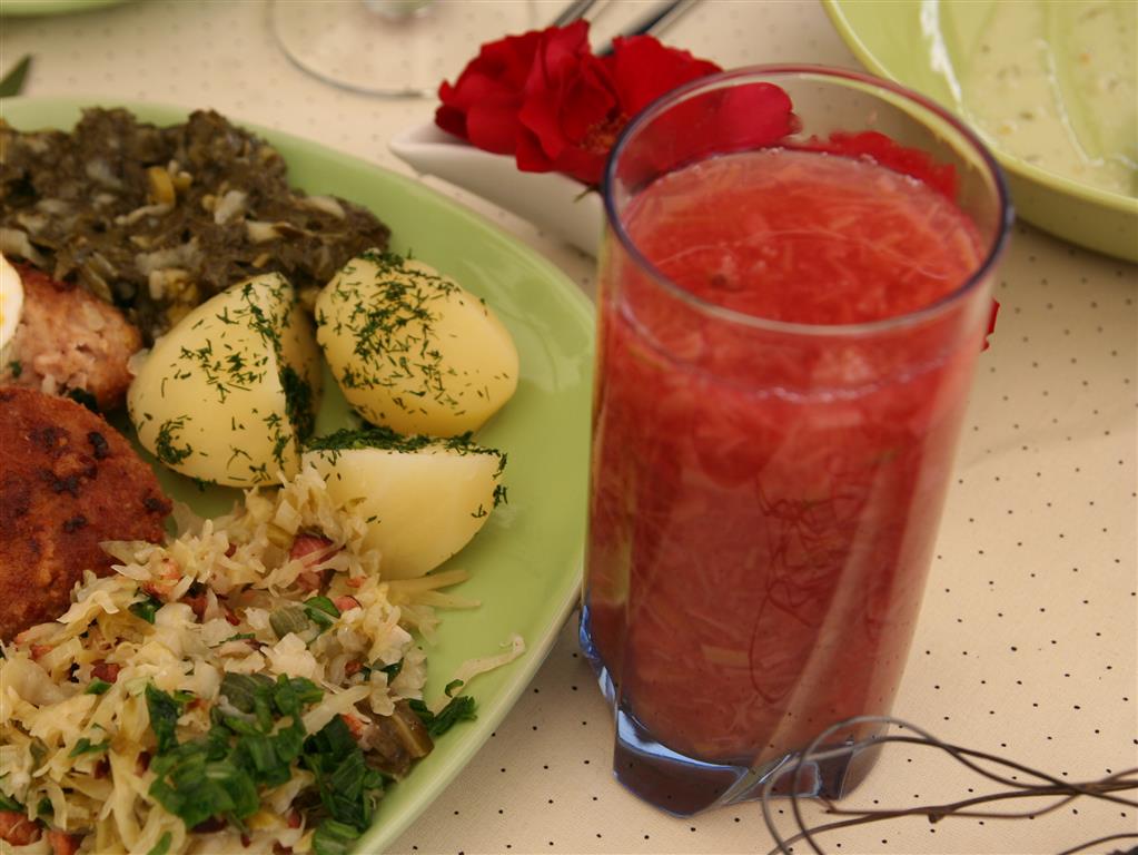Sporządzamy marynatę z pokrzyw, żubrówki, tymianku. Karczek kroimy w plastry, rozklepujemy, posypujemy solą i pieprzem, pozostawiamy w marynacie co najmniej 1,5 godz., grillujemy. Kapustę szatkujemy, krótko gotujemy w mleku, odcedzamy, dodajemy kremówkę, redukujemy do uzyskania gęstej konsystencji; dodajemy kwaśną śmietanę, koperek i doprawiamy do smaku. Ziemniaki gotujemy, odcedzamy, dodajemy mleko, sporządzamy purée, łączymy ze szczypiorkiem.