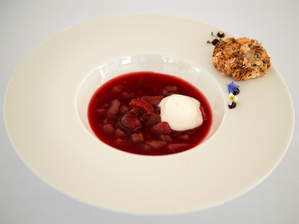 Rabarbar z miętą zapakować wacum i gotować w niskiej temperaturze (60oC) około 20-30 minut. Po wyjęciu oddzielić rabarbar od mięty. Sam rabarbar miksować, dodać do smaku grenadinę i miód (ewentualnie cukier puder). Ciasteczko owsiane przygotować przez połączenie mieszanki musli, miodu, ryżu preparowanego, kokosu i mleka skondensowanego. Wymieszane składniki zapiec w piekarniku w temp. 160oC przez 10-15 min. aby uzyskać złoty kolor.
