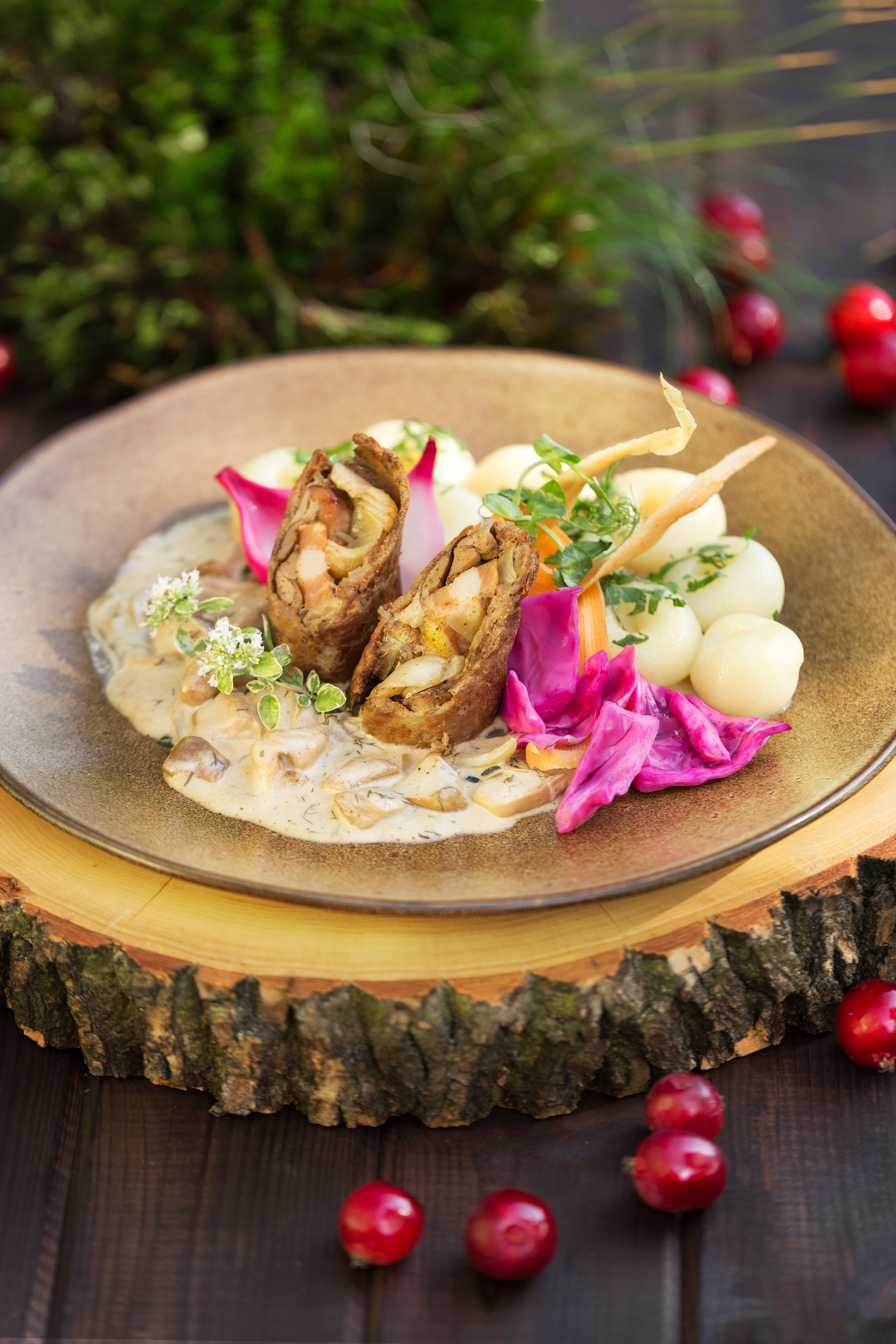 Tuszkę z królika wytrybować, zostawiając comber razem ze skórą z mostka. Przyprawić solą, pieprzem. Nadziać jarzynką z pokrzywy (umytą pokrzywę wrzucić na 2-3 minuty na lekko osolony wrzątek, odcedzić, przelać zimną wodą, osączyć, drobno usiekać, wymieszać z orzechami i zieleniną. W rondlu stopić masło, zeszklić na nim drobno pokrojoną cebulę, dodać pokrzywę i drobniutko usiekany czosnek, sól, pieprz, skropić sokiem z cytryny i chwilę dusić na niewielkim ogniu, dokładnie wymieszać) doprawić chrzanem, na wierzch ułożyć marchew. Zwinąć roladę, owinąć mocno folią. Piec w piekarniku. Przed podaniem obsmażyć na złoty kolor na smalcu.