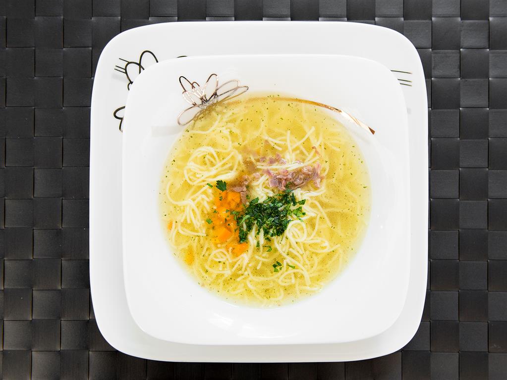 Mięso umyć, włożyć do garnka, zalać wodą i dodać warzywa oraz przyprawy, doprowadzić wodę do wrzenia, gotować na małym ogniu około 2 godziny. Makaron ugotować.