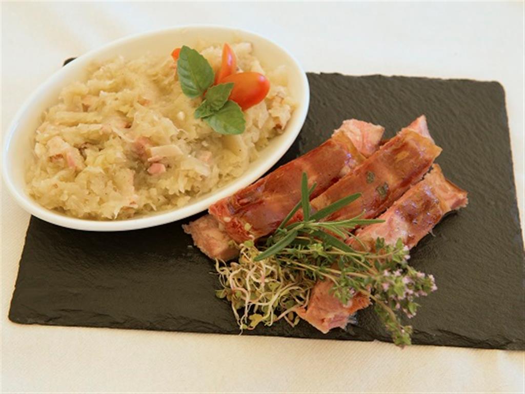 Kapustę ugotować, dodając kilka ząbków drobno pokrojonego lub przeciśniętego przez praskę czosnku, pokrojoną cebulę i przyprawy. Na patelni usmażyć pokrojony w kostkę boczek. Z mąki zrobić zasmażkę. Ugotowaną kapustę zagęścić zasmażką i startym ziemniakiem. Dodać skwarki z boczku i dokładnie wymieszać. Podawać z ugotowanymi żeberkami.