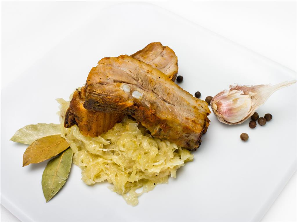 Żeberka umyć, pokroić na porcje, oprószyć solą, papryką. Smalec rozgrzać, cebulę drobno pokroić i poddusić na smalcu, dodać porcję żeberek i przyprawy. Dusić, w połowie duszenia dodać przecier pomidorowy i kiszoną kapustę. Razem dusić do miękkości. Podawać z całymi ziemniakami.
