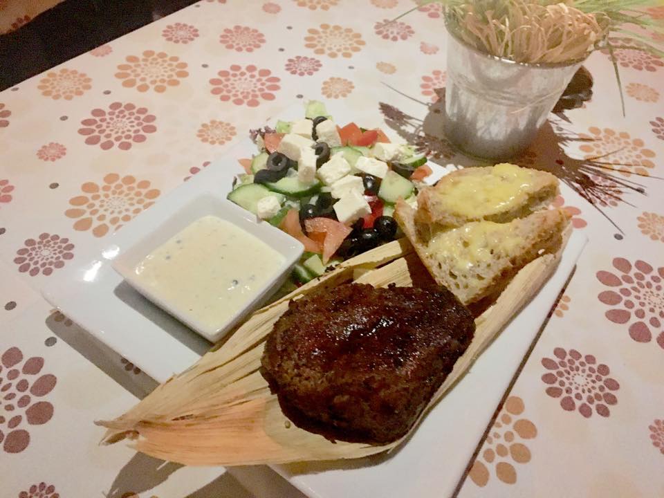 Grzyby usmażyć na niewielkiej ilości oleju z dodatkiem cebuli. Ziemniaki, cebulę obrać, zetrzeć na tarce, przyprawić solą, pieprzem, maggi, dodać jaja, mąkę, śmietanę kremową. Wszystko dobrze wymieszać i porcjować na patelni smażąc na oleju. Steki rozbić młotkiem do mięsa, przyprawić pieprzem, solą, maggi, curry, czosnkiem. Smażyć na oleju do uzyskania odpowiedniej kruchości. Podawać na talerzu placek-stek-placek z dodatkiem smażonych grzybów leśnych.
