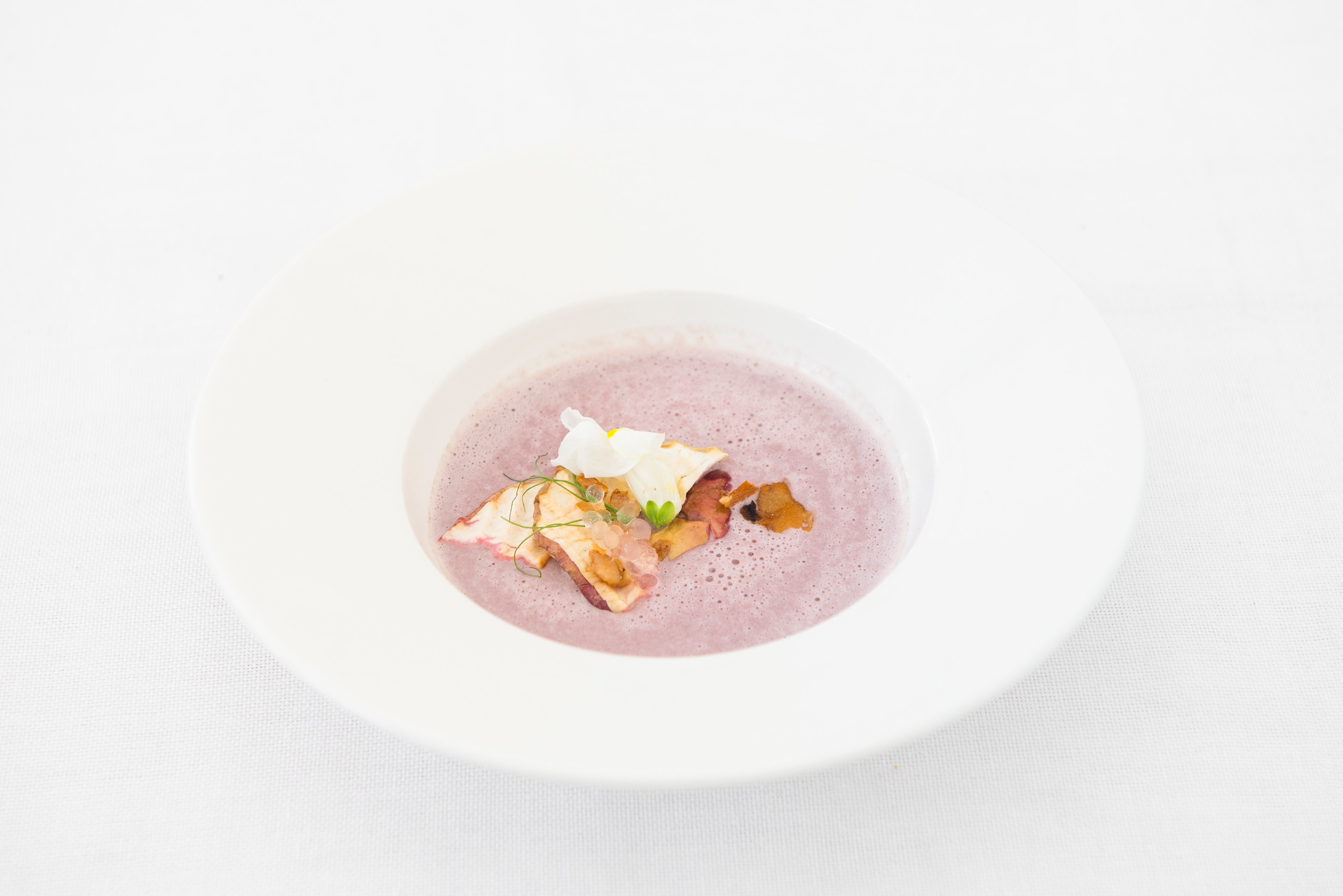 Na patelni usmażyć chrupiące skwarki. Szalotki pokroić w drobną kostkę i poddusić w niewielkiej ilości tłuszczu pozostałego po skwarkach. Jabłko obrać, oczyścić z pestek i zetrzeć razem z modrą kapustą na drobne paski. Starte jabłko i kapustę podsmażyć w garnku, zalać bulionem i sokiem z pomarańczy. Zagotować zupę, zmiksować i doprawić do smaku solą, pieprzem i gałką muszkatołową, dodać śmietanę. Dla polepszenia efektu można zupę podawać z syfonu, wlać na talerz. Podać z krążkami suszonych jabłek i chrupiącymi skwarkami. Jabłka suszyć, cienko pokrojone w plastry w temperaturze ok. 50-70 stopni przez ok. 1 godzinę.