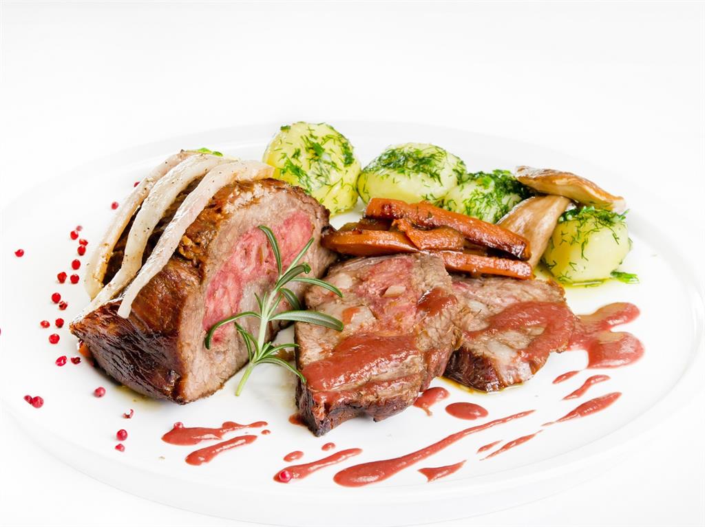 Mięso naszpikować słoniną i boczkiem, posolić, natrzeć zmiażdżonym czosnkiem. Na smalcu obsmażyć pokrojoną włoszczyznę i cebulę oraz przyprawione mięso, poddusić razem z zielem angielskim i jałowcem, a następnie dopiec w piekarniku. Sos z pieczenia odtłuścić, dodać konfiturę z żurawiny, kilka plasterków cytryny i pomarańczy oraz namoczone wcześniej śliwki. Zagęścić mąką. Zagotować, dodać do smaku cukier i ocet. Zredukowanym i przecedzonym sosem polać pokrojone mięso.