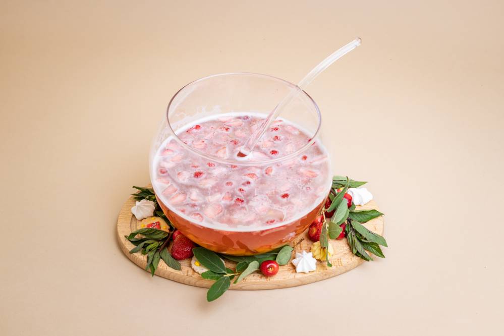 Świeże owoce na noc zasypać cukrem, aby puścił sok. Następnego dnia pokroić wszystkie owoce w dużą kostkę, przełożyć do szklanej, większej wazy tzw. bołli, dodać wodę mineralną, wino, syrop z owoców. Delikatnie wymieszać. Schłodzić, a przed podaniem wlać szampan i ponowne wymieszać. Nalewać chochlą do szklanek, najlepiej o grubym dnie. W razie dodać kostki lodu.