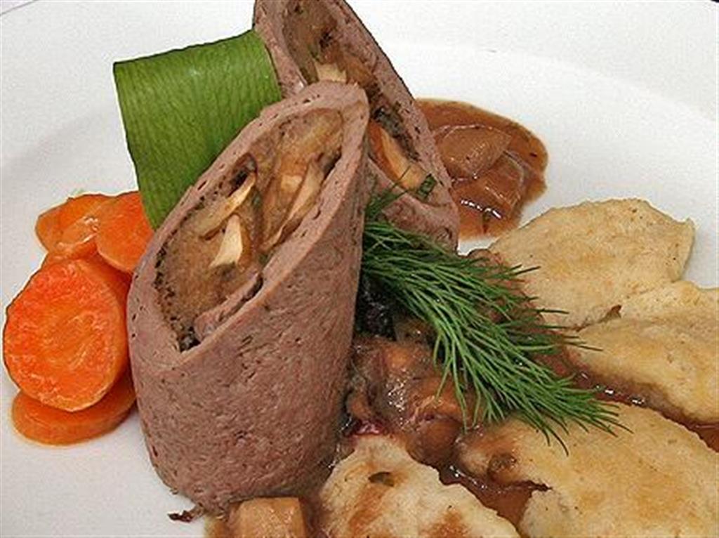 Mięso pokroić w plastry, rozbić, przyprawić solą i pieprzem, posmarować musztardą. Na mięsie rozłożyć równomiernie ogórki pokrojone w paski i boczek wędzony oraz pokrojoną w cząstki cebulę. Plastry mięsa zwinąć, uformować rolady, obwiązać białą nitką, oprószyć mąką i smażyć na rozgrzanym smalcu na patelni ze wszystkich stron. Przełożyć do rondla, podlać tłuszczem ze smażenia i ciepłą wodą, dodać listek laurowy i ziele angielskie, dusić do miękkości. W czasie duszenia rolady obracać i podlewać, a gdy mięso będzie miękkie, wyjąć i sporządzić sos.