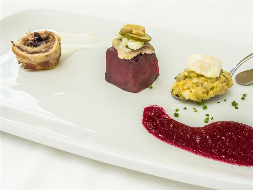 Śledzie moczymy i dzielimy na 3 porcje: 1 - marynujemy z pieczarkami, cebulą, ogórkiem konserwowym, podajemy na pieczonym z miodem i anyżem buraku, dekorujemy pianą smakową,