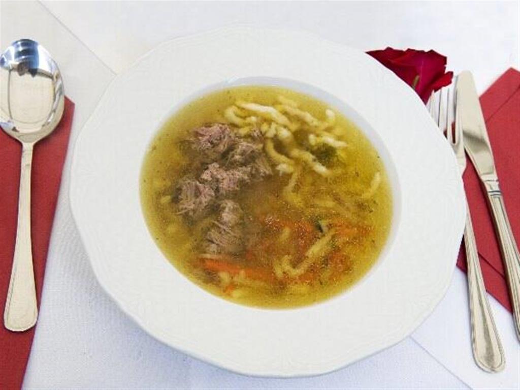 Przygotowujemy rosół, gotując mięso z warzywami do miękkości. Czysty przecedzony wywar doprawiamy solą i pieprzem. Z mąki, jajka, wody i soli przygotowujemy ciasto, z którego robimy lane kluski. Rosół podajemy z lanym ciastem i pokrojoną w kosteczkę piersią z gęsi.