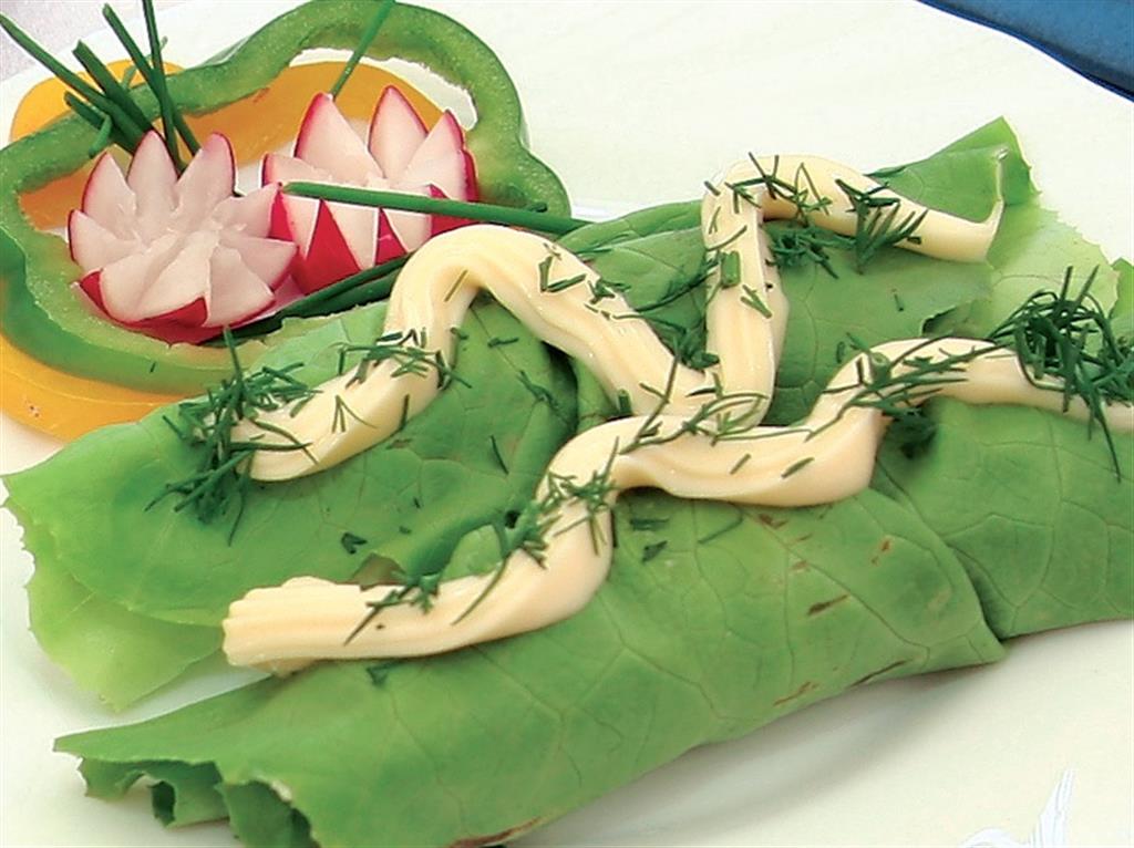 Majonez ucieramy z bryndzą, dodajemy posiekane orzechy, pokrojoną szynkę i posiekany koperek. Tak powstałą masą smarujemy liście sałaty i zwijamy w rulony. Po wierzchu polewamy majonezem i posypujemy koperkiem. Układamy na półmisku i dekorujemy pomidorem.