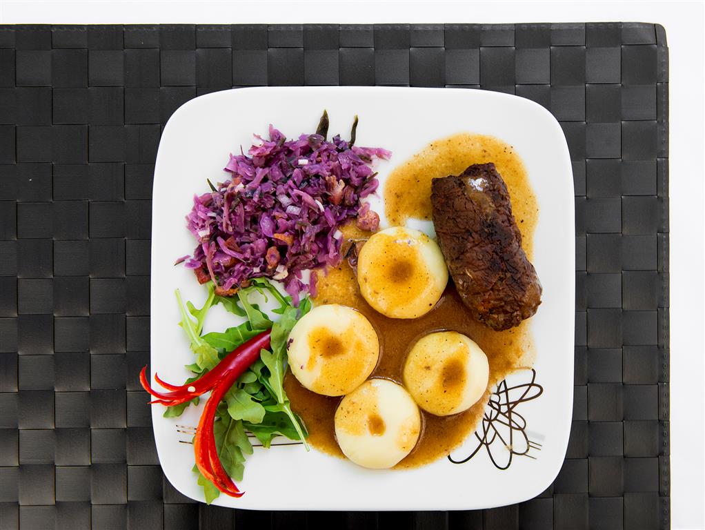 Ziemniaki ugotować w osolonej wodzie, odcedzić i przestudzić. Ciepłe przecisnąć przez praskę na wysypaną mąką stolnicę. Dodać oba rodzaje mąki, jajka i razem szybko wyrobić. Formować wałki i skośne kroić w równe kawałki. Gotować w osolonej wodzie. Szpinak ugotować w osolonej wodzie, dobrze odcisnąć, drobno posiekać i usmażyć na dwóch łyżkach masła. Dodać rozgnieciony czosnek, jajka i namoczoną odciśniętą bułkę, dobrze wymieszać i doprawić do smaku solą i pieprzem. Wołowinę pokroić w plastry, dobrze rozbić, oprószyć przyprawami i mąką. Masę szpinakową rozsmarować na mięsie. Zwinąć rolady, dosmażyć na tłuszczu i dusić w bulionie do miękkości.