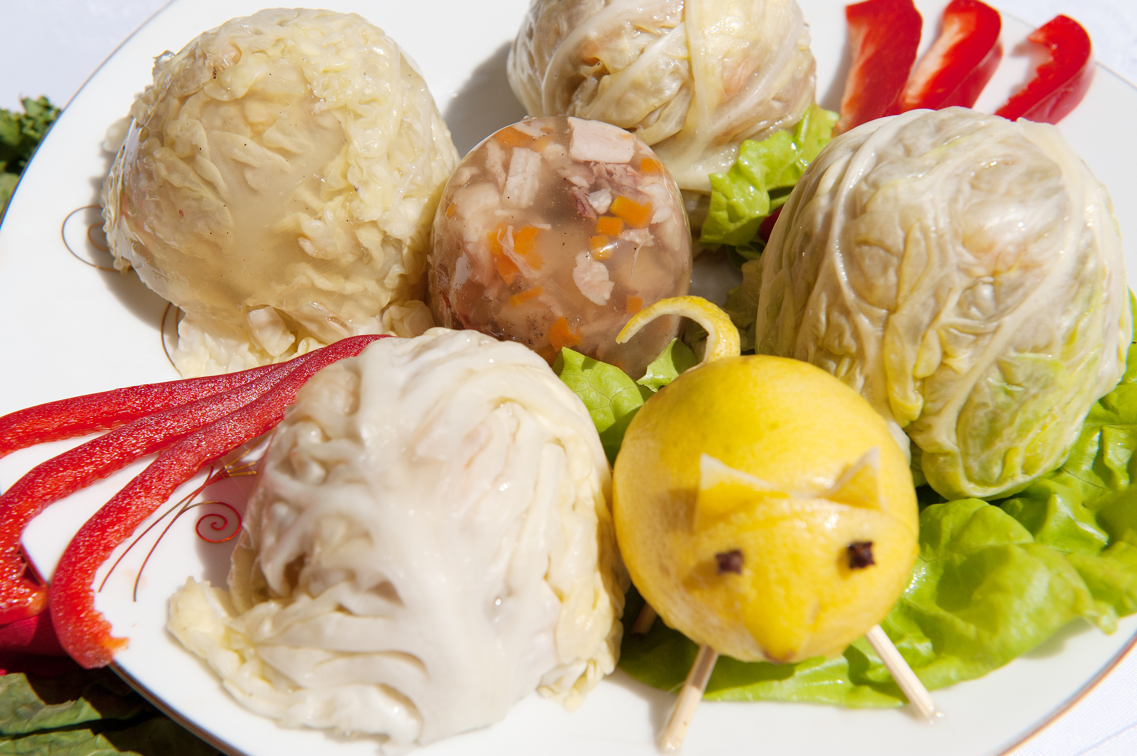 Umyte mięsa, obrane warzywa (bez kapusty) oraz przyprawy zalać zimną wodą o gotować na małym ogniu, aż ratki będą miękkie. Liście kapusty sparzyć i rozbić lekko tłuczkiem, mięso obrać z kości, wywar przecedzić. Wyłożyć formę folią spożywczą, a następnie liśćmi kapusty. Ułożyć w formie obrane mięso i zalać wywarem. Liście założyć do środka. Całość zwinąć folią i zawinąć. Mocno schłodzić do stężenia. Galaretę podawać pokrojoną w plastry z chanem, octem i cebulą lub same z chlebem.
