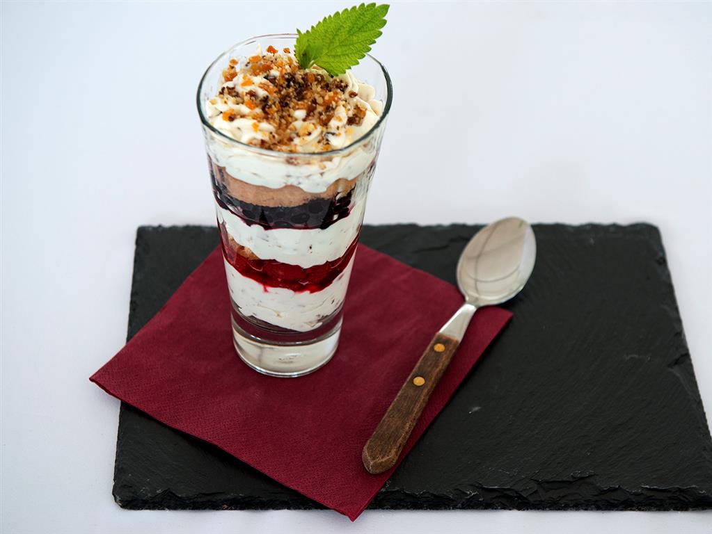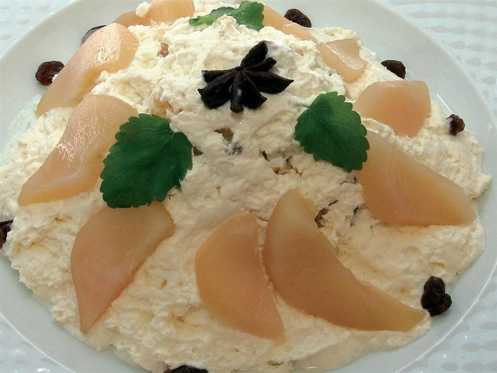 Kruszony biszkopt ugniatamy z masłem i bakaliami (orzechami, kokosem, rodzynkami) i nasączamy żubrówką. Podajemy na talerzu z bitą śmietaną oraz gruszką o aromacie anyżu w formie wypukłej kopy przyozdobionej melisą.