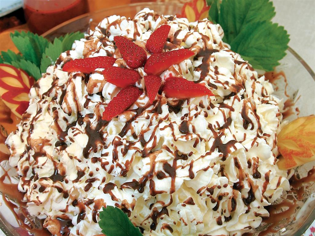 4 jajka ubijamy z 8 łyżkami cukru i cukrem waniliowym, a następnie ucieramy z 2 kostkami masła. Łączymy krem masłowy z pokruszonym biszkoptem i uprzednio namoczonymi w spirytusie bakaliami. Formujemy kopę, którą dekorujemy ubitą śmietaną i owocami. Podajemy z małą kawą.