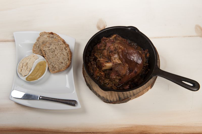 Golonka z pieca chlebowego pieczona w warzywach, podawana w aromatycznym sosie z chrzanem i musztardą oraz pajdą swojskiego chleba