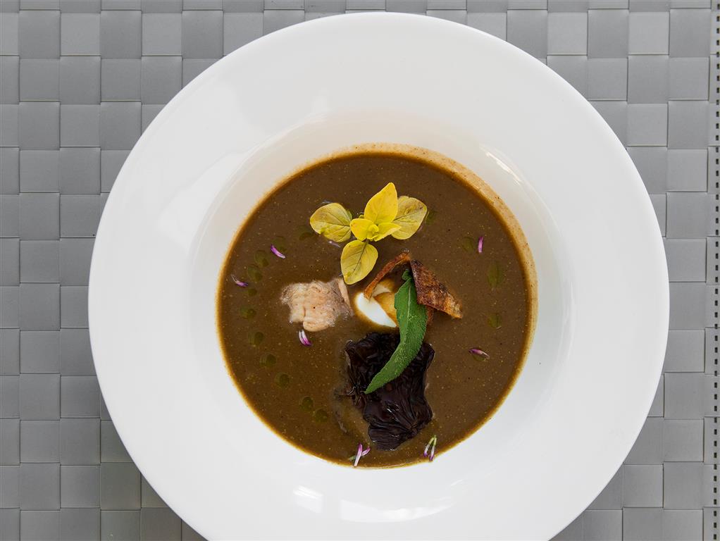 Pstrągi filetować i odstawić w chłodne miejsce. Na bazie pozostałości z pstrąga należy gotować intensywny wywar z dodatkiem włoszczyzny. W międzyczasie namoczyć suszone grzyby i je obgotować. Łączyć wywar grzybowy, rybny i dodać do tego pokrojoną włoszczyznę oraz grzyby. Doprawić solą i pieprzem, gotować to wszystko razem dodając liść laurowy, ziele angielskie, świeżą kolendrę. Na koniec dodać filety z pstrąga tylko do zaparzenia.