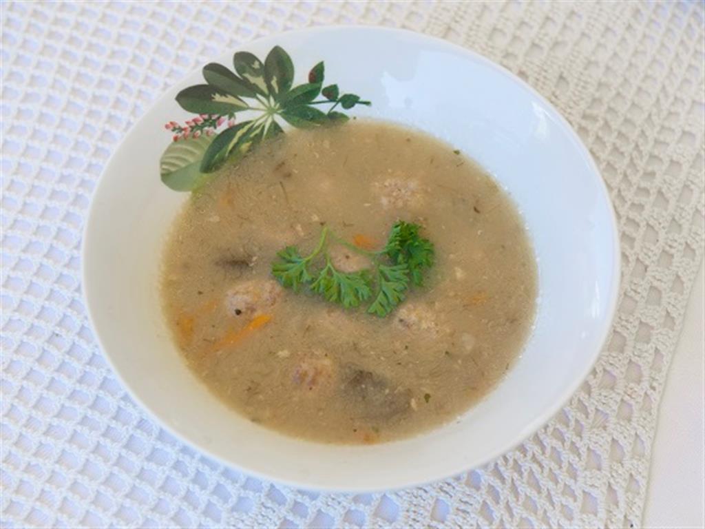 Mięso doprawić do smaku , dodać jajko, bułkę tartą i dokładnie wymieszać. Uformować małe kulki i podpiec aby lekko się zrumieniły. Grzyby pokroić w cieniutkie plasterki i podpiec je na maśle razem z rozdrobnioną cebulą i czosnkiem, lekko poddusić. Do garnka wlać 8-10 szklanek wody i zagotować następnie włożyć przygotowane kulki mięsne i gotować na wolniejszym ogniu.