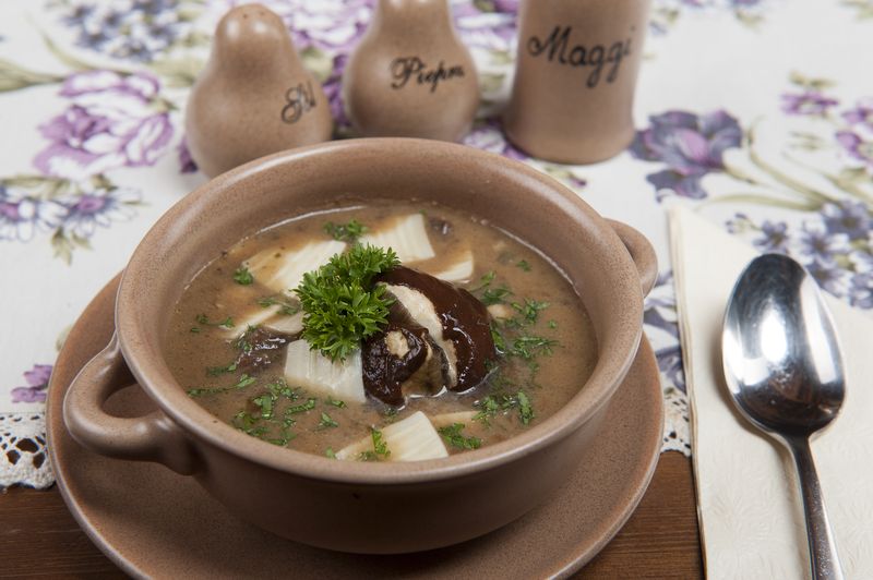Przygotowujemy wywar drobiowo-wołowy z warzywami, do którego dodajemy grzyby i przyprawiamy do smaku. Po ugotowaniu dodajemy makaron. Zupę zagęszczamy mąka pszenną i zabielamy śmietaną.