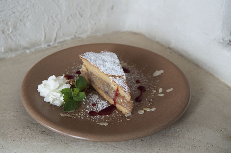 Jabłecznik z bakaliami. Przepis pochodzi z lat 50-tych od babci Bronki, babci Szefa kuchni. Przepis był przekazywany z pokolenia na pokolenie, dzięki temu ciasto smakuje tak samo jak u babci.