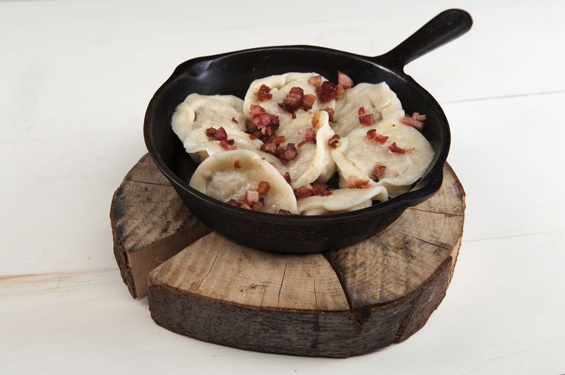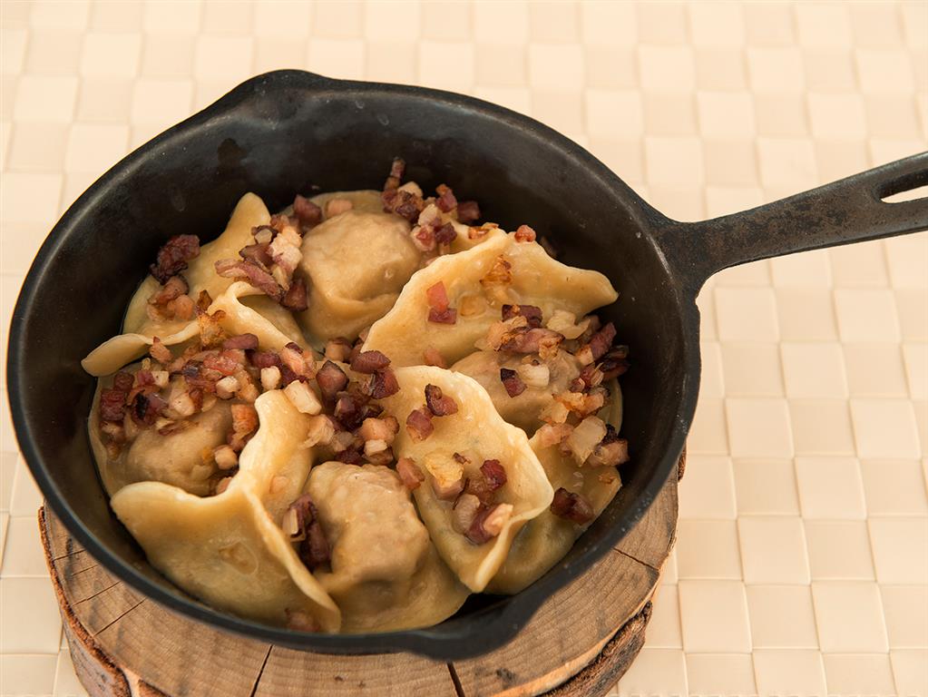 Ręcznie lepione pierogi z mięsem podawane na małej patelni z dodatkiem skwarków.