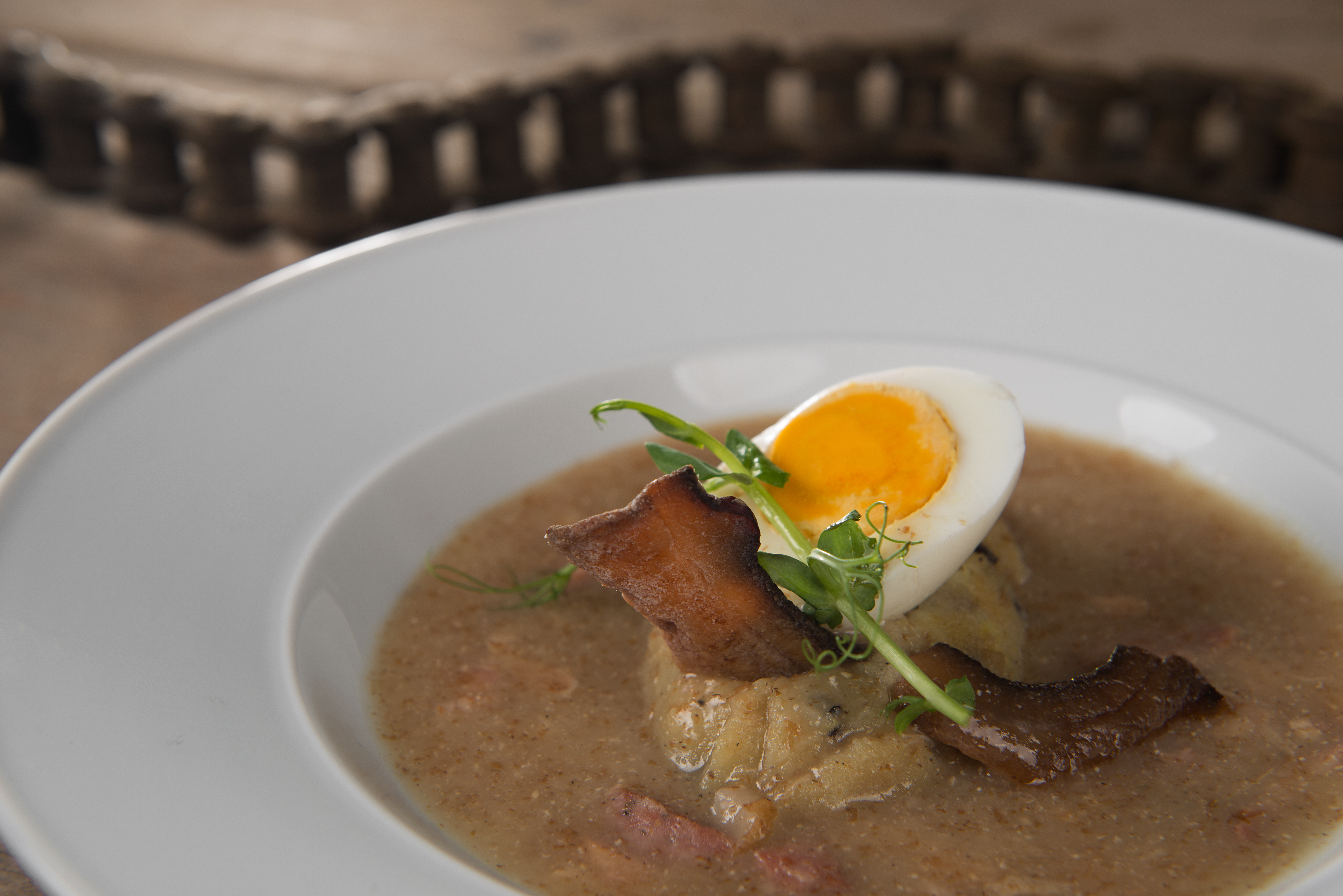 Fasolę namoczoną ugotować do miękkości i odstawić na bok. Wędzone kości schabowe, gotować ok. godziny dodając przyprawy. Wyjąć kości i obrane z nich mięso wrzucić do wywaru i gotować dalej na małym ogniu. Przesmażyć boczek z cebulką i dodać do wywaru. Wywar zalać żurkiem z mąki żurkowej i gotować jeszcze 10 – 15 minut, pod koniec dodać potarty w dłoniach majeranek i ugotowaną fasolę.