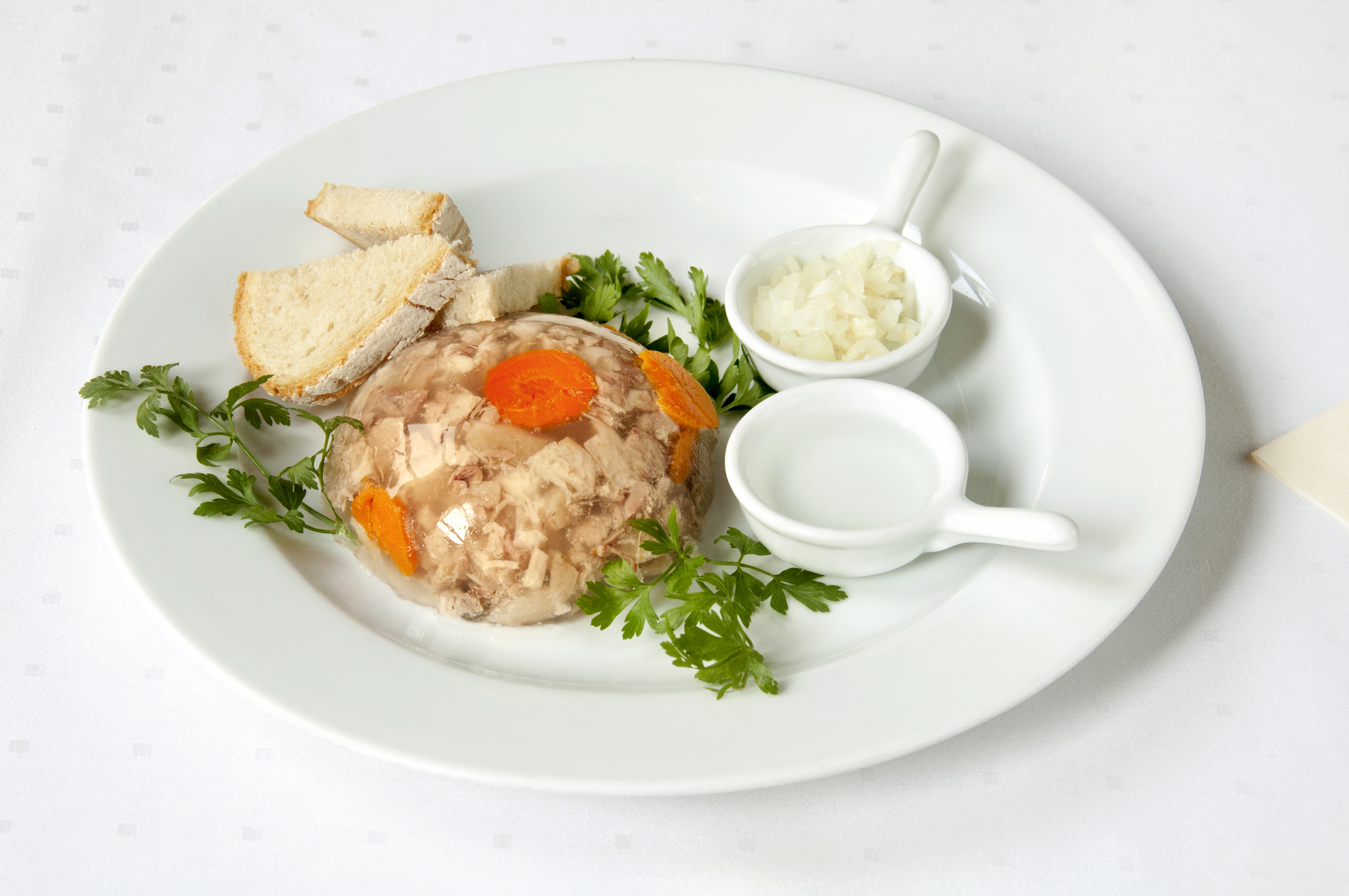 Zulc czyli galaretka z nóżek wieprzowych, podana z cebulką, octem i chlebem