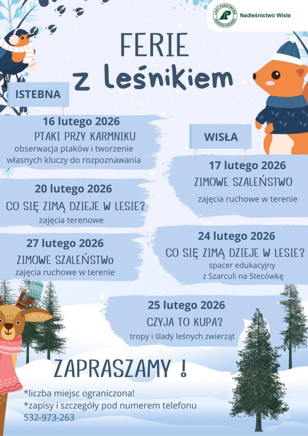 Nadleśnictwo Wisła zaprasza dzieci, młodzież i dorosłych na zimowe spotkania w lesie - będzie tropienie zwierząt, obserwacja ptaków przy karmniku, spacery edukacyjne i trochę ruchowego „szaleństwa” na świeżym powietrzu.