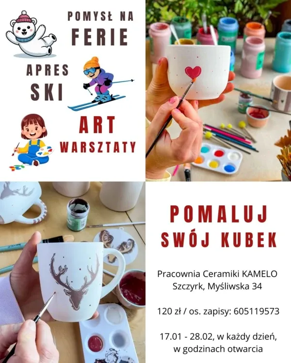 W lokalnej pracowni ceramicznej Kamelo czekają na Gości setki biskwitowych kubków, farby ceramiczne, pędzle, szablony, wzory, inspiracje oraz mini kawiarenka artystyczna. Codziennie w czasie ferii zimowych można przyjść i spędzić miło czas malując swój własny kubek! Organizatorzy częstują domowymi wypiekami, korzenną herbatą i pyszną kawą.