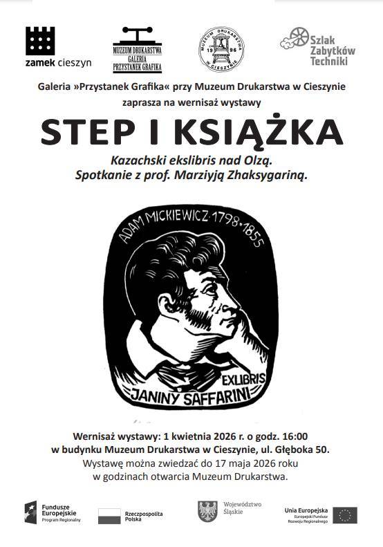 Muzeum Drukarstwa w Cieszynie zaprasza na wystawę twórczości Mәrziyi Zhaksygariny "Step i książka". Wernisaż wystawy odbędzie się 01 kwietnia 2026r o godzinie 16:00, wystawę będzie można zwiedzać do 17 maja 2026r.