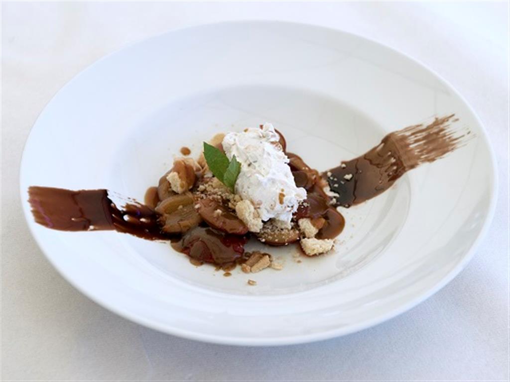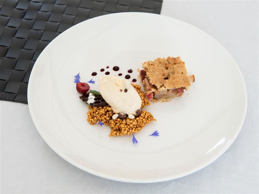 Lody z koziego mleka i miodu wrzosowego, kamień z białej czekolady w towarzystwie gruszkowo-rabarbarowego kołacza z kruszonką owsianą