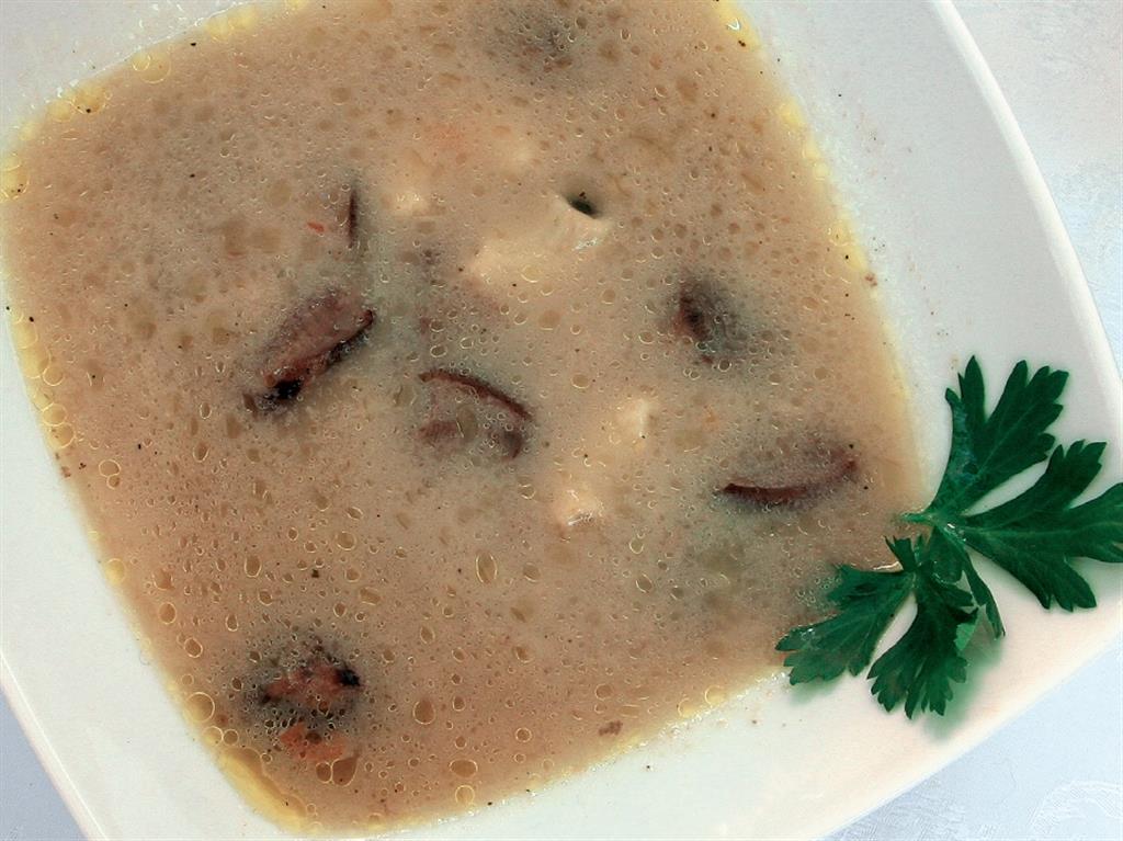 Przygotowujemy wywar drobiowo-wołowy z warzywami, do którego dodajemy grzyby i przyprawiamy do smaku. Po ugotowaniu dodajemy makaron. Zupę zagęszczamy mąka pszenną i zabielamy śmietaną.