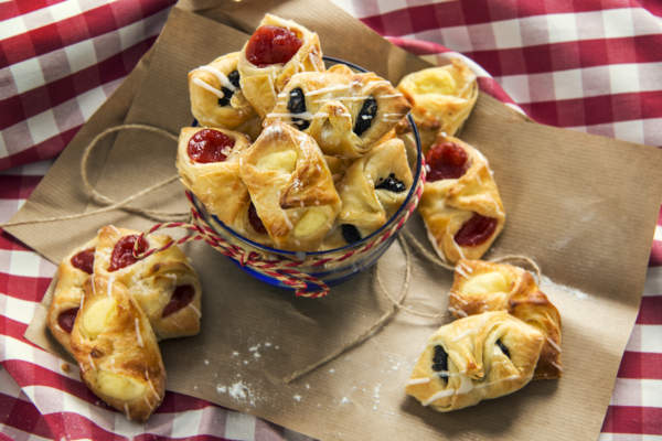Ciastka z nadzieniem z marmolady, sera lub maku, posypane cukrem pudrem lub polukrowane. Struktura wewnętrzna wyraźnie listkowana, popękana.