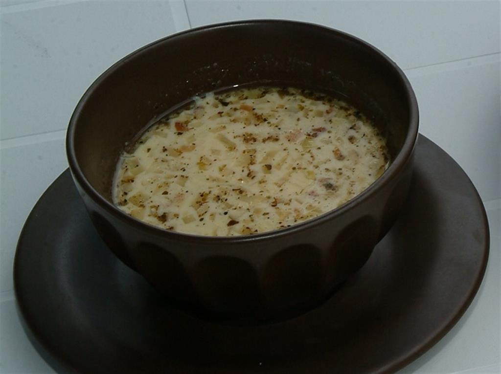 Zupa jasnej barwy z widocznymi skwarkami, przesmażoną cebulą i ziemniakami