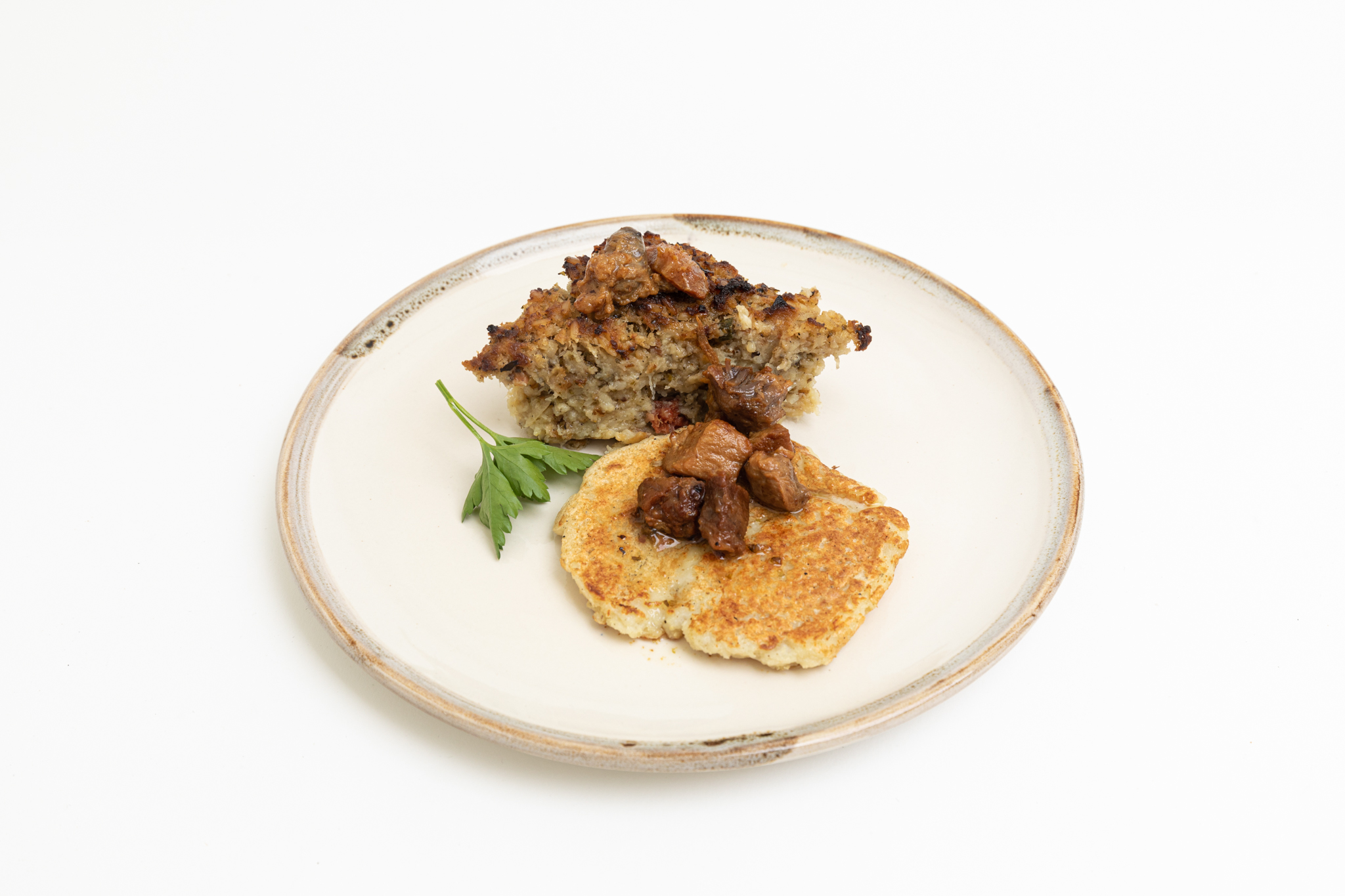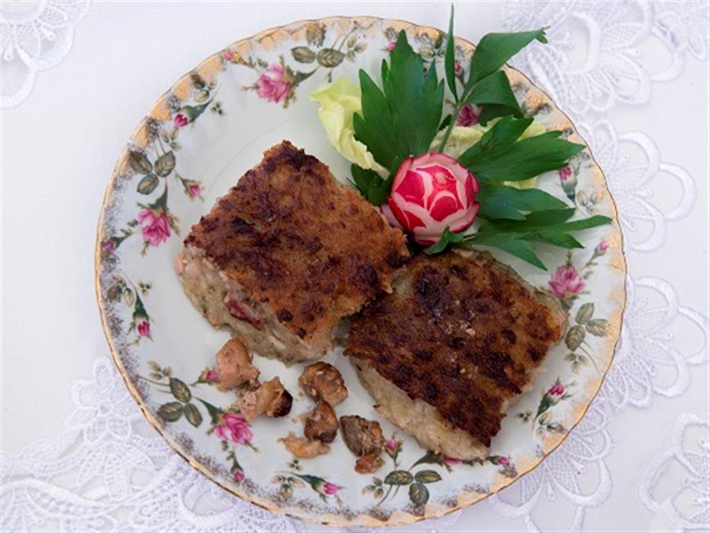 Placek z ciasta ziemniaczanego z widocznymi na przekroju ziarnkami ryżu.