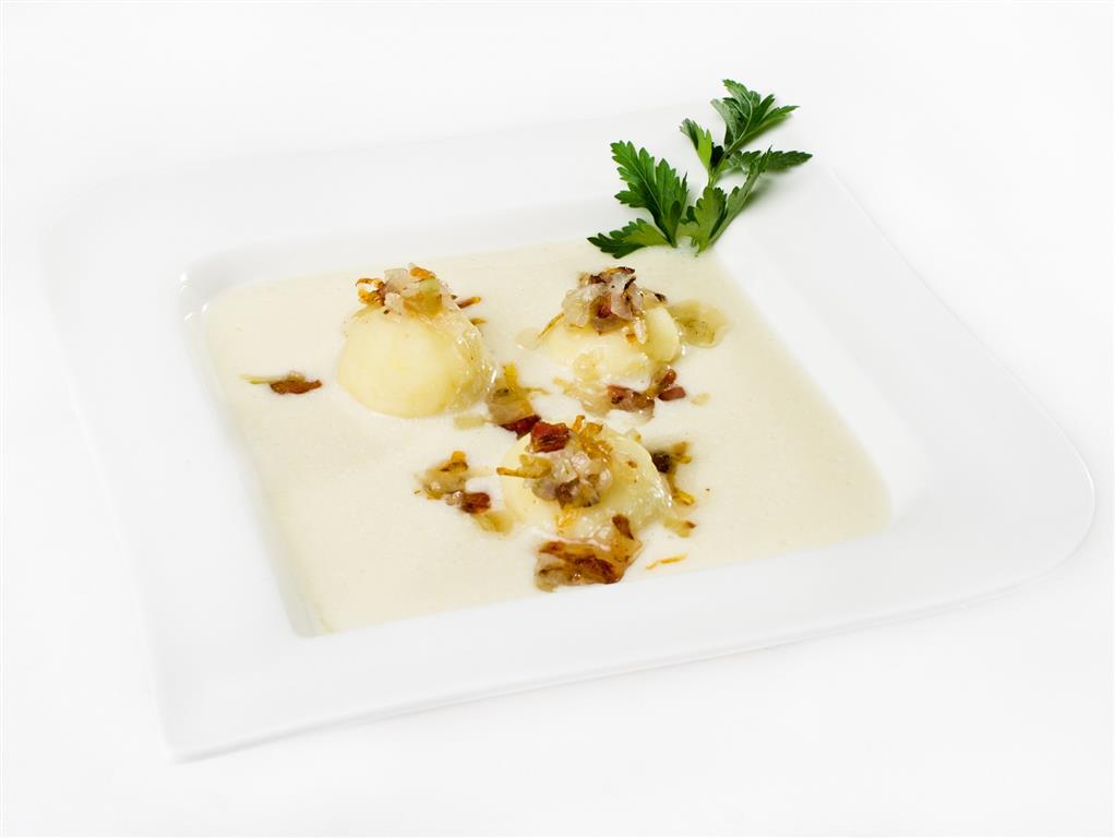 Kremowa dość gęsta zupa z widocznymi kawałkami boczku, ziemniaków i zielonego kopru.