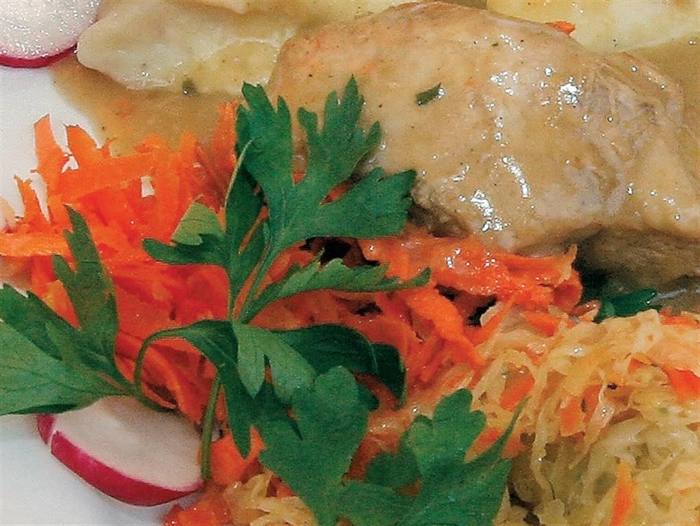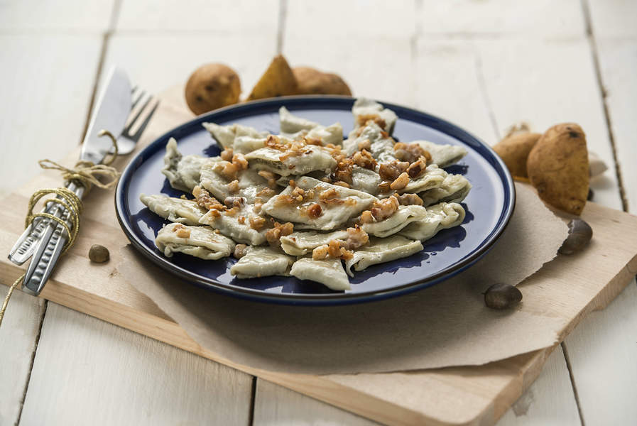Wyczuwalny smak ciasta makaronowego i tartych ziemniaków z okrasą z cebulki.