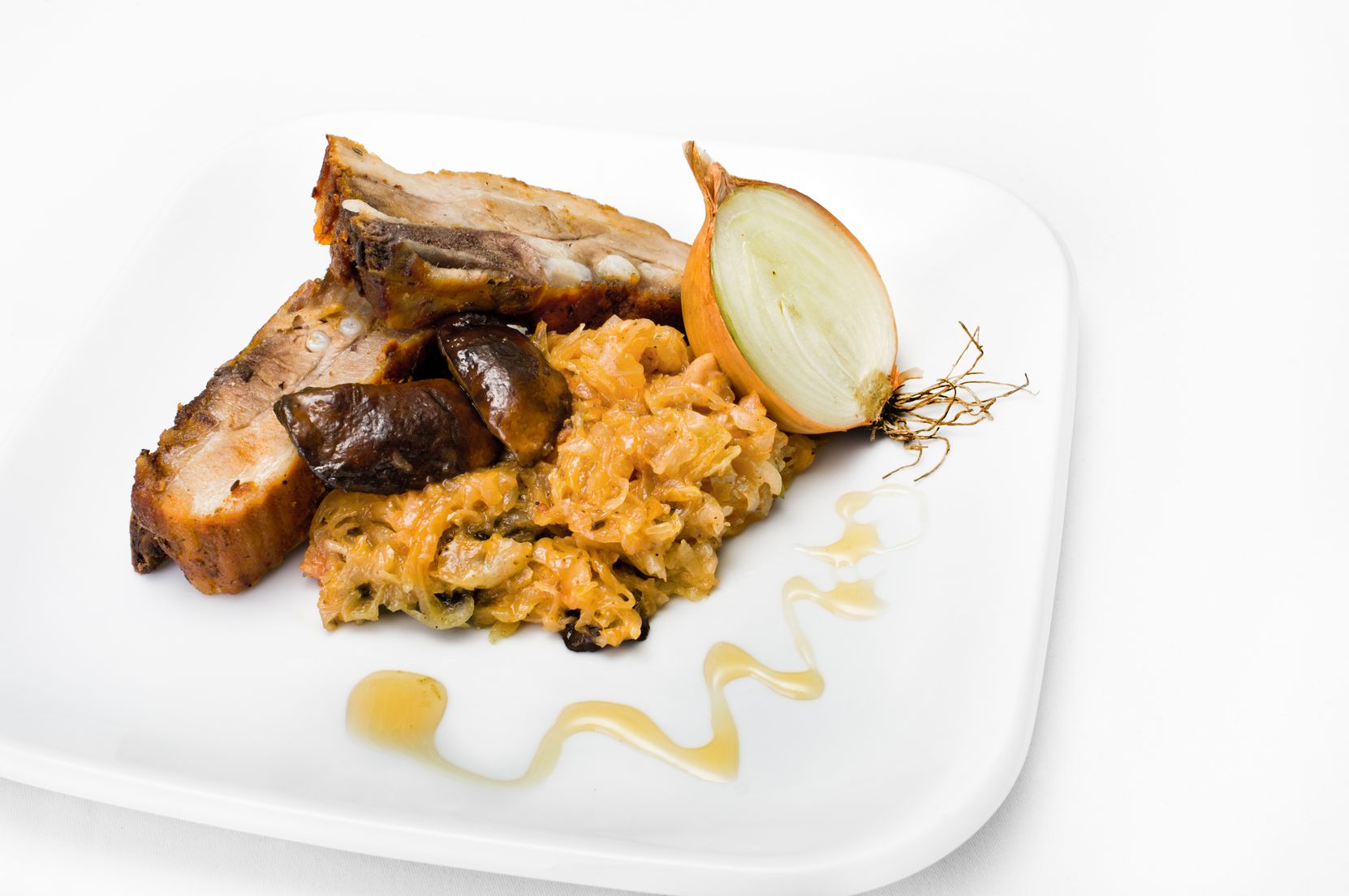 Żeberka na miodzie z kapustą kiszoną i grzybami
