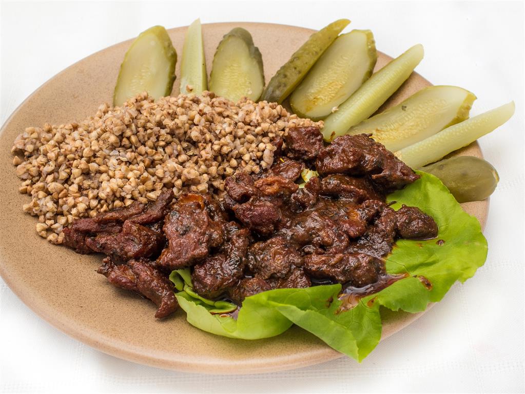 Mięso pokroić w średnią kostkę, drobno pokrojoną cebulę zeszklić na smalcu, dodać czosnek, podsmażyć, podlać szklanką wody, zagotować, włożyć mięso, doprawić do smaku, dusić pod przykryciem, dolać piwa i gotować na wolnym ogniu. Gulasz podać z kaszą i ogórkami.