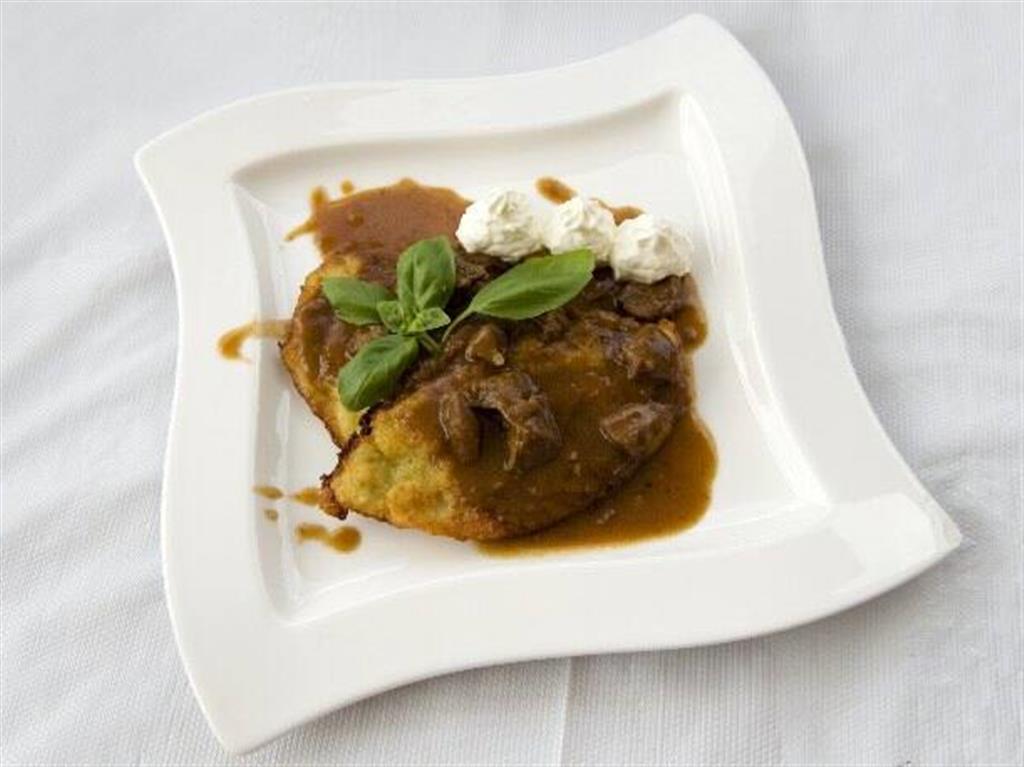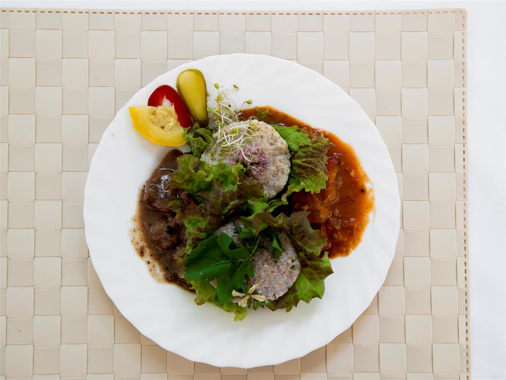 Dziczyzna/topinambur/jarmuż/podgrzybek. Wykwintne danie wywodzące się z czasów rodu Donnersmarcków, którzy często polowali w lasach pszczyńskich i dziczyzna często gościła na ich stołach.