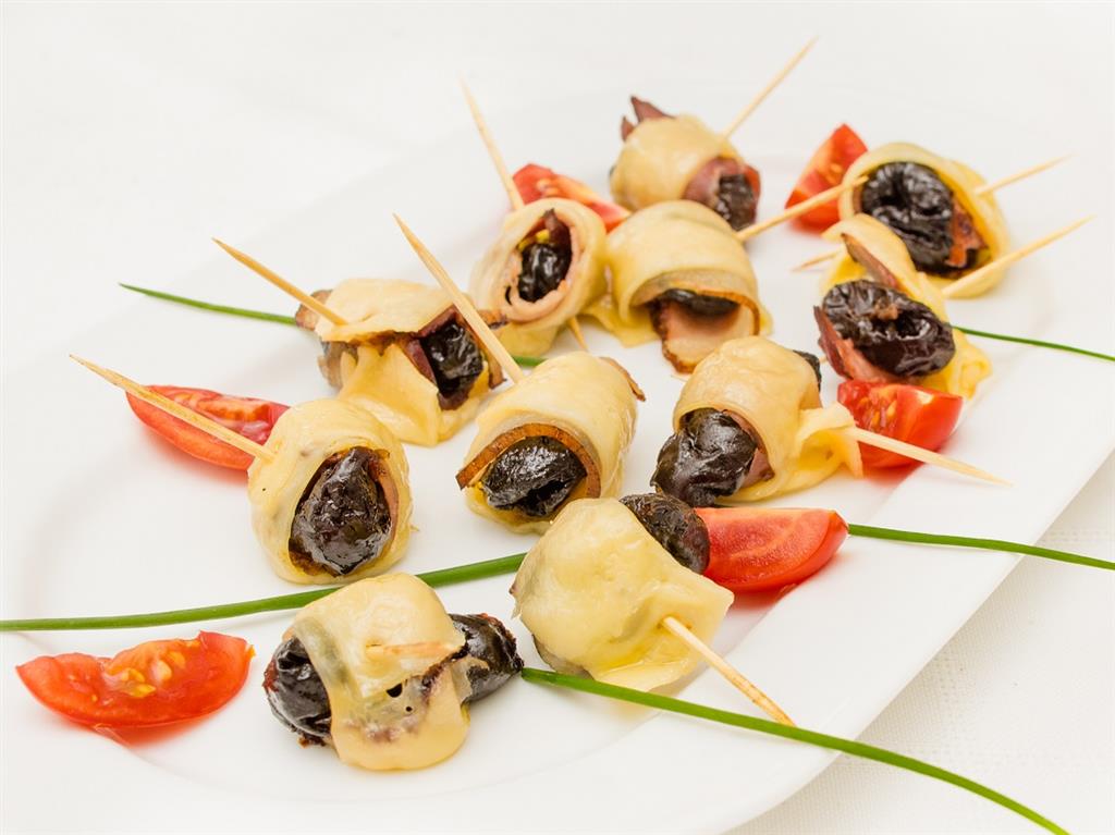 Śliwki owinąć boczkiem i serem żółtym, spiąć wykałaczkami, zapiekać do rozpuszczenia sera.