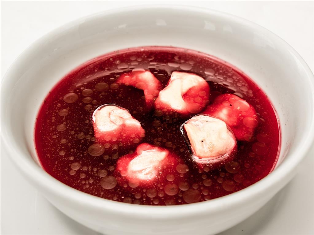 Śledzie moczymy i dzielimy na 3 porcje: 1 - marynujemy z pieczarkami, cebulą, ogórkiem konserwowym, podajemy na pieczonym z miodem i anyżem buraku, dekorujemy pianą smakową,
