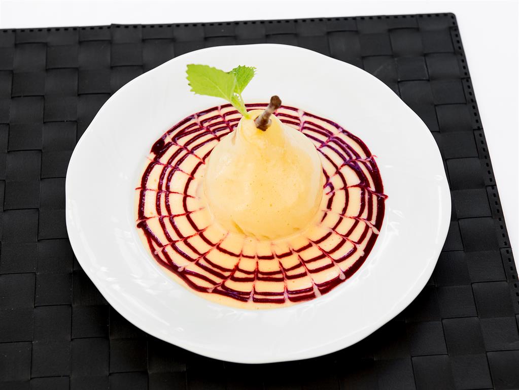 Obrane i oczyszczone gruszki gotować na wolnym ogniu do miękkości w małej ilości wody. Powstały wywar połączyć z sokiem z brzoskwiń i białym winem, dodając żółtek utartych z cukrem tworząc tym samym sos zabajone.