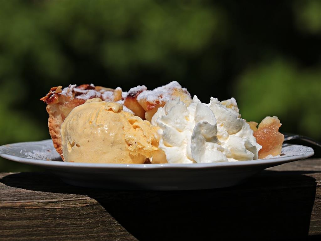 Szarlotka własnego wypieku na gorąco z lodami waniliowymi kardamonem i bitą śmietaną.