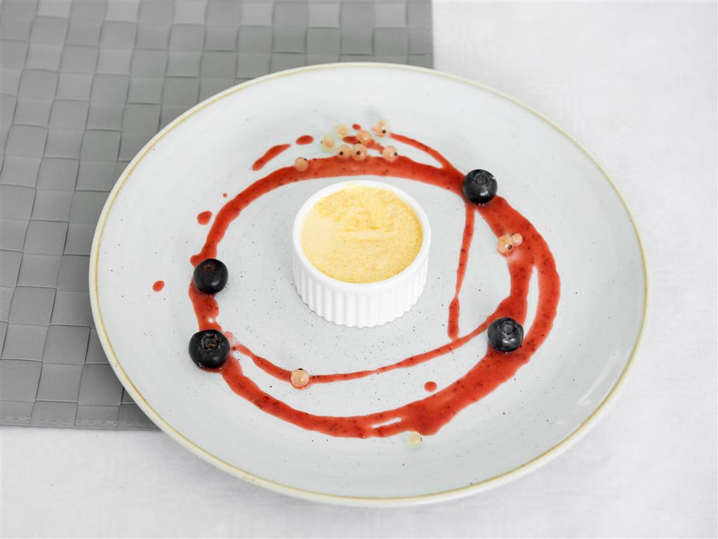 Szpajza o smaku kwiatów czarnego bzu/sos truskawowo-tymiankowy/kruszonka/borówka