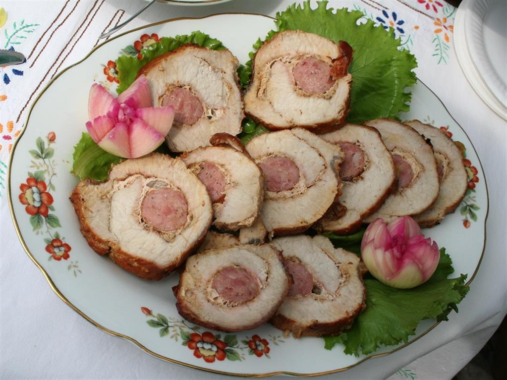Mięso oddzielić od kości, naciąć poziomo, posypać przyprawami, natrzeć czosnkiem. W nacięcie włożyć kiełbasę, całość obwiązać nitką, oprószyć solą i dobrze zarumienić ze wszystkich stron na smalcu. Podlać bulionem i dusić 0,5 godziny. Zdjąć pokrywę i piec w piekarniku skrapiając wodą. Z upieczonego schabu zdjąć nitkę i pokroić w plastry. Sos podprawić zawiesiną z wody i dwóch płaskich łyżeczek mąki.