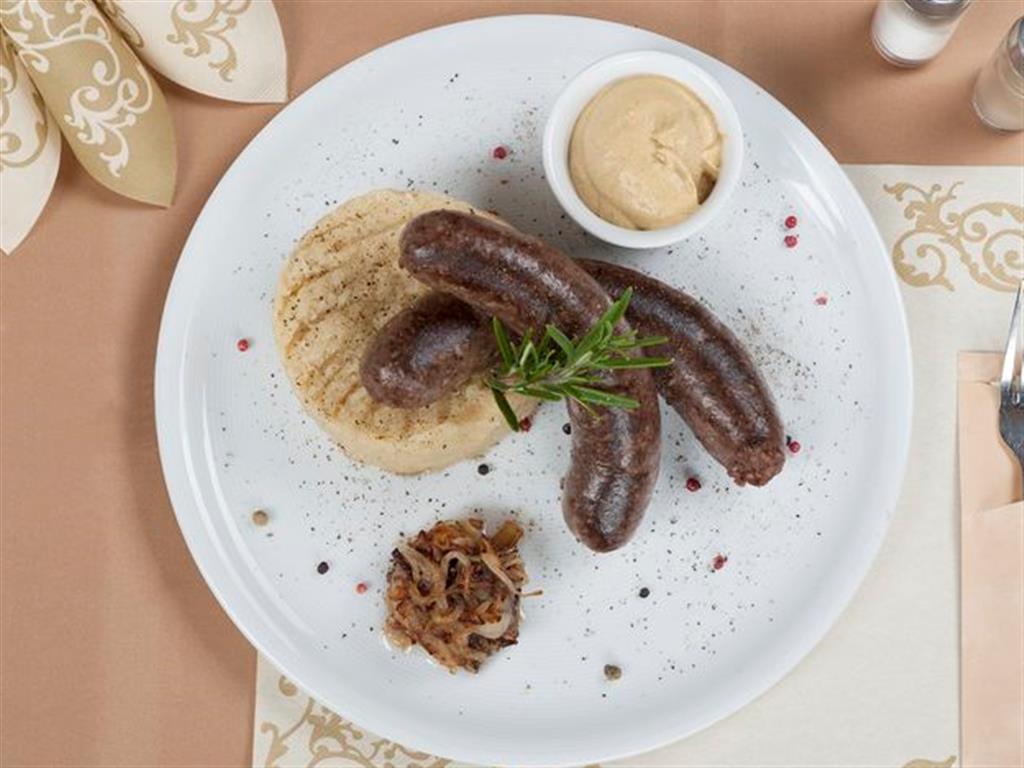 Krupniok grilowany, podawany z kapustą kiszoną i ziemniakami.