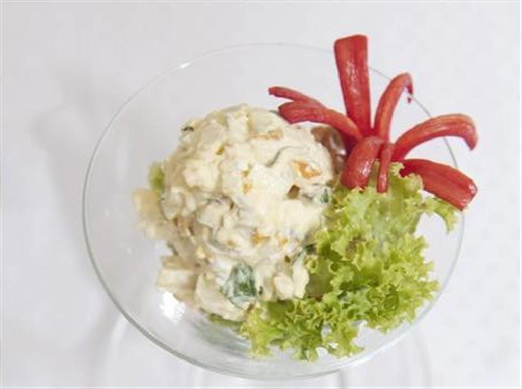 Wszystkie składniki kroimy w kostkę, doprawiamy solą i pieprzem, następnie łączymy z majonezem i mieszamy. Podajemy w salaterce ozdobione zieleniną.