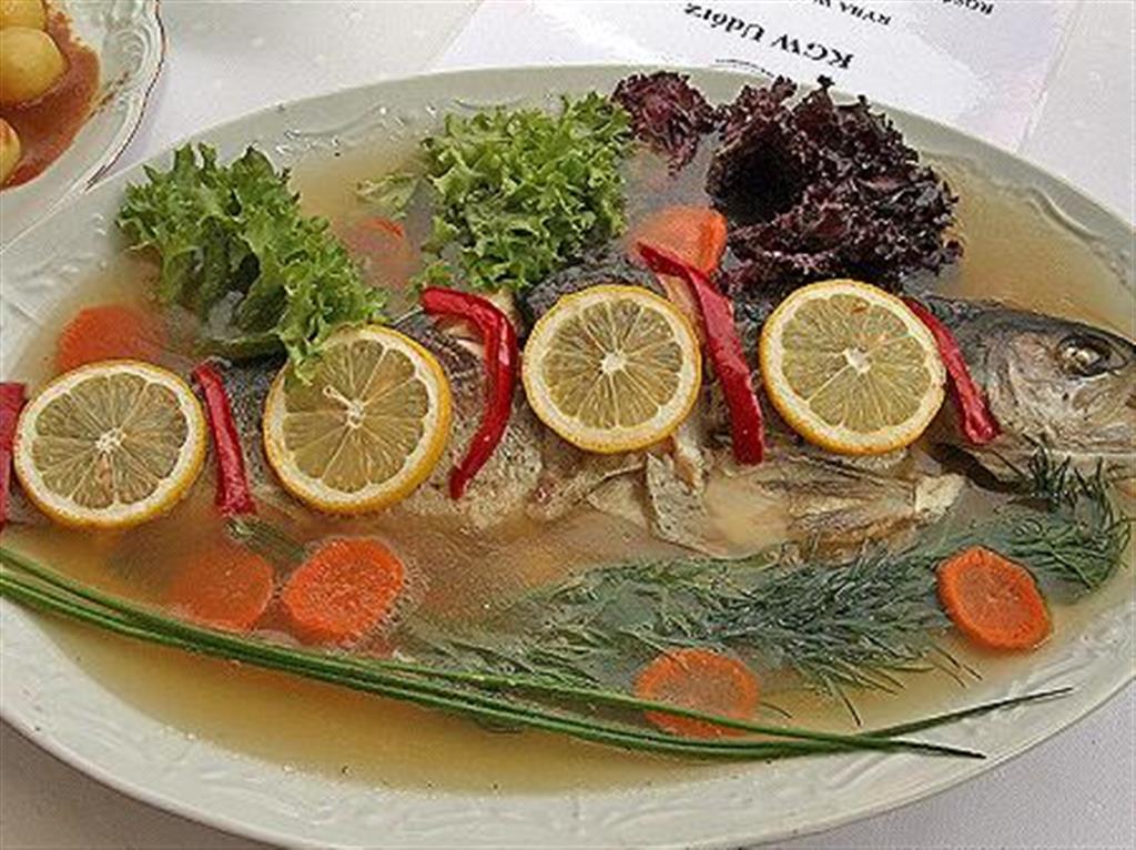 Gotujemy wywar z pokrojonych w skośne plastry przyprawionych warzyw. Rybę kroimy w porcje, wkładamy do wrzącego wywaru, solimy i gotujemy do miękkości. Żelatynę moczymy w zimnej wodzie, gdy nasiąknie rozpuszczamy w wywarze z ryby. Doprowadzamy do wrzenia. Ugotowaną rybę układamy na półmisku lub salaterce, zdobimy ugotowanymi warzywami i zalewamy przestudzonym wywarem. Po zastygnięciu podajemy z dodatkiem cytryny lub octu.